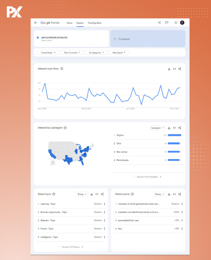 For example, when searching for “personalized products” on Google Trends, we can see that related queries such as “promotional products” and “personalized gifts” are currently trending upward.