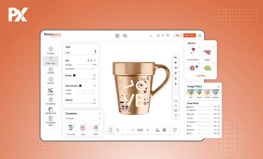 With product designer tools, customers can choose any product to add their text, images, clipart, and other design elements and give it a new customized look.