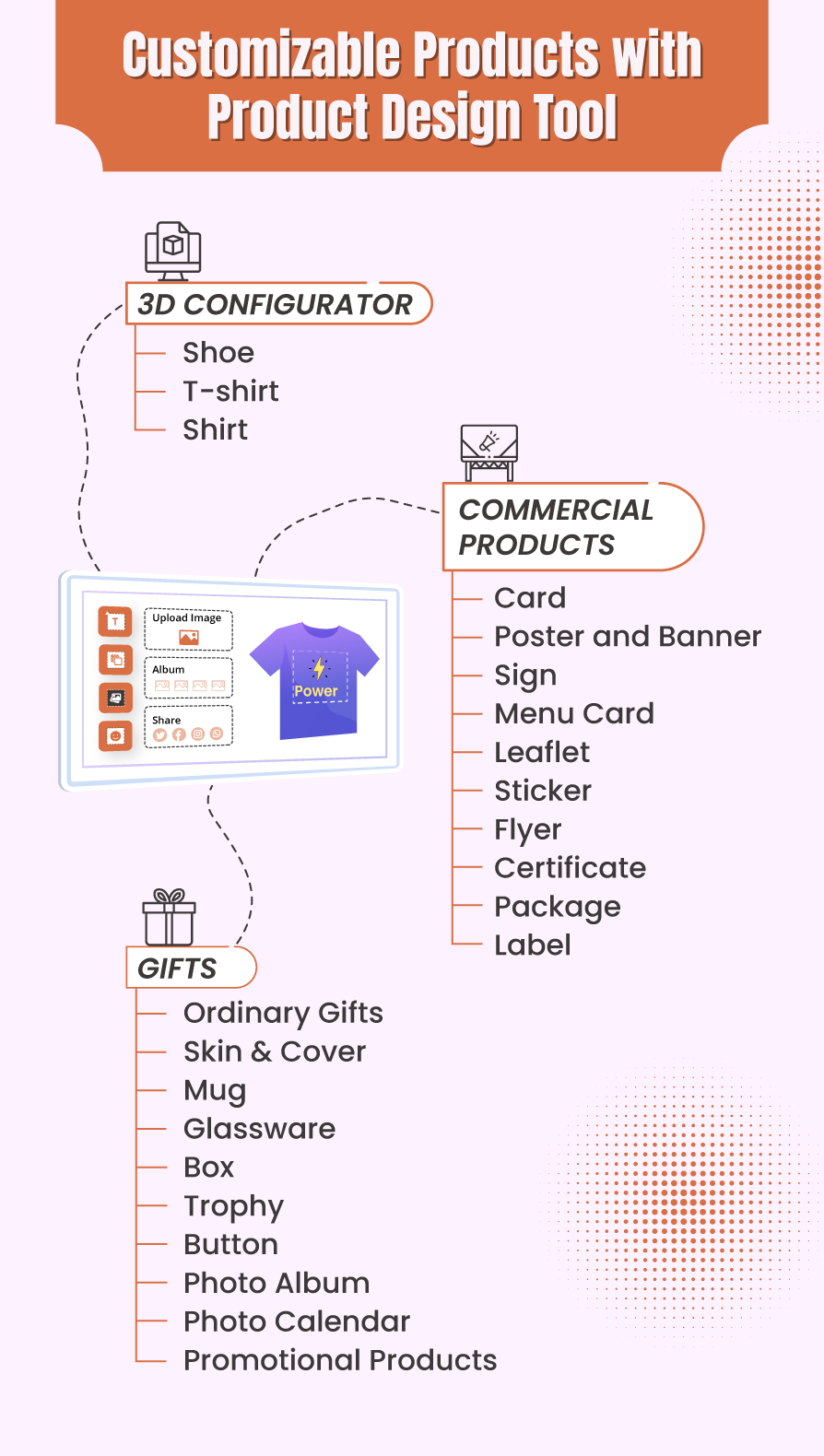- Offer your customers a wide range of personalized products, including apparel, commercial items, gifts, and more.