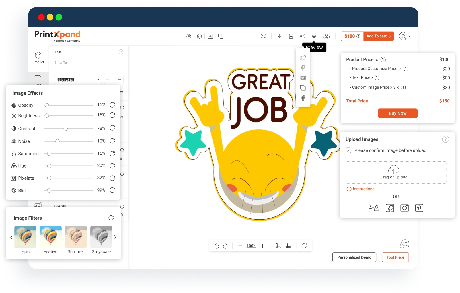 Enables customers to personalize products with filters, cropping, and layering tools. All of this can be done on the product design page, making customization easy while increasing sales.