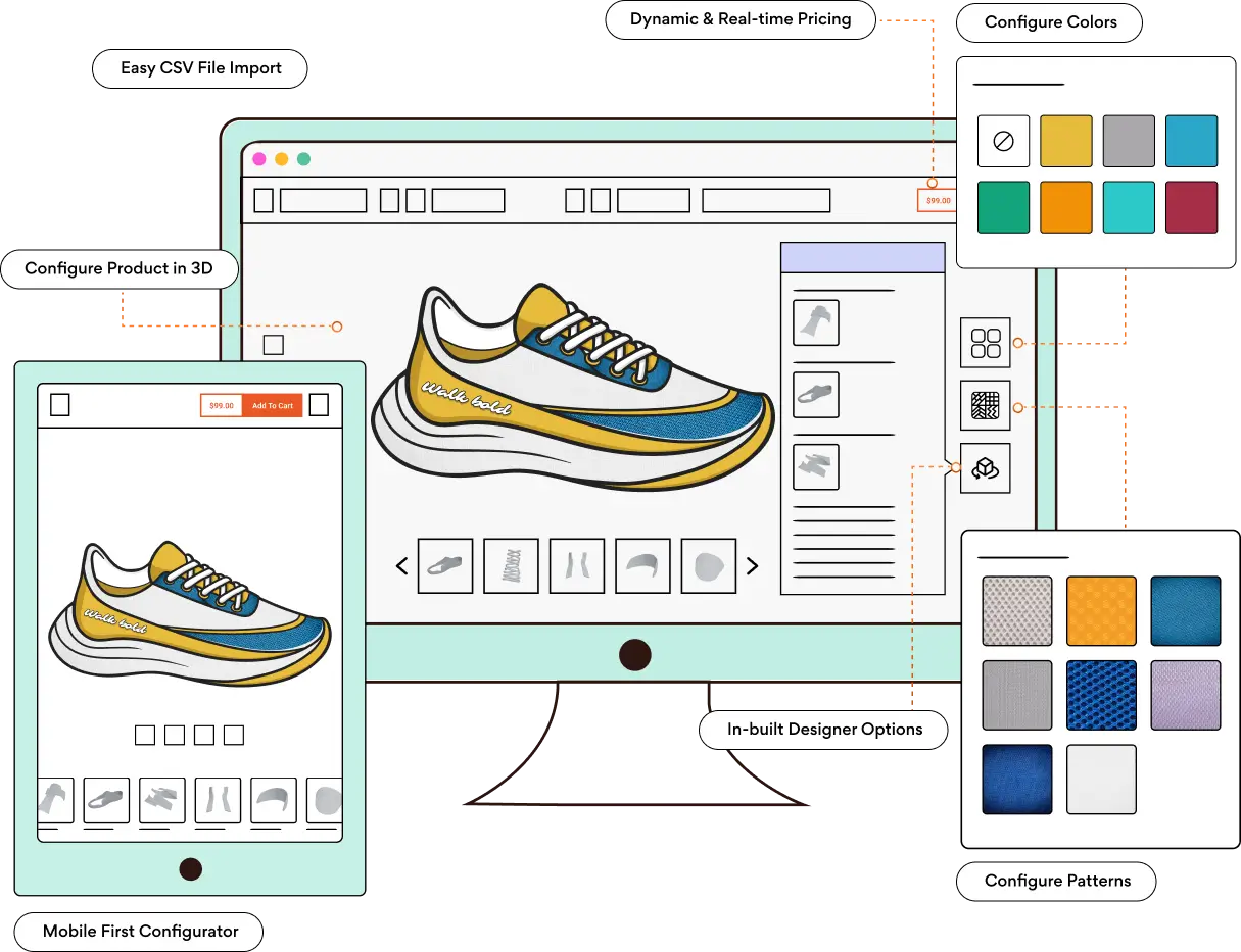 Upgrade your customization offerings with our 3D shoe configurator. Let customers configure products with our 3D configurator and see interactive, real-time 3D previews before ordering.