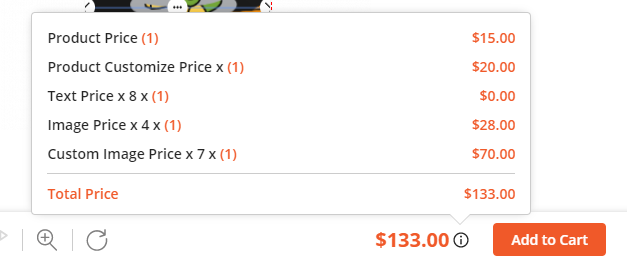 You can charge for clipart, text, color, quotes, etc. You can configure these dynamic prices on a particular product as well as for the entire store.