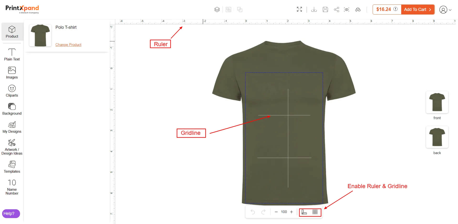 Ruler and grid line helps users align and position different objects when customizing a product.