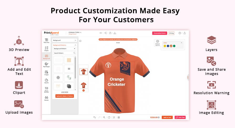 Every customer coming to your store has different needs. Product customization is the key to deliver a more personalized customer experience. PrintXpand is a one-stop destination for all your customization needs. Our product design tool comes with diverse features, responsive UI and easy-to-use for end-users to personalize their products.
