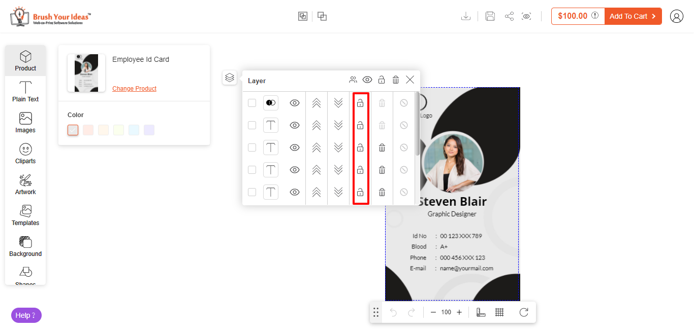 For instance, if there’s an ID card, you can lock may be the logo or the placement of an image. That will restrict users from making any further changes.