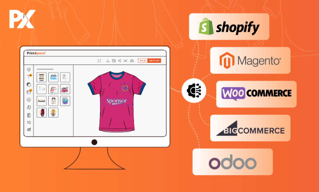 PrintXpand’s apparel product personalization connects directly with platforms like Shopify, Magento, WooCommerce, BigCommerce, Odoo, and others through ready-made plug-ins or APIs. There is no need to rebuild your site or manage disconnected systems.