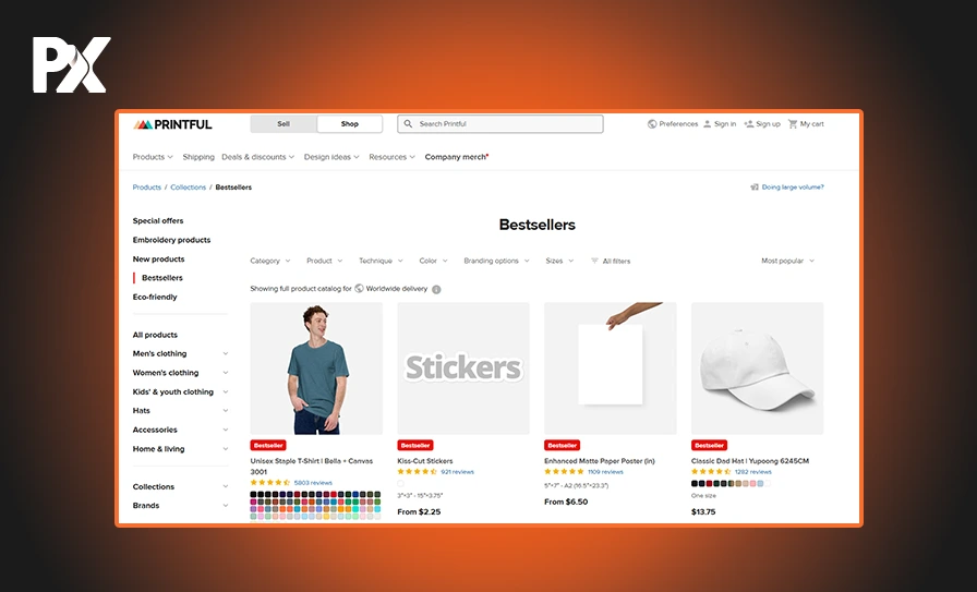 Printful’s store has a modern and user-friendly interface that focuses on displaying product images and customization options.