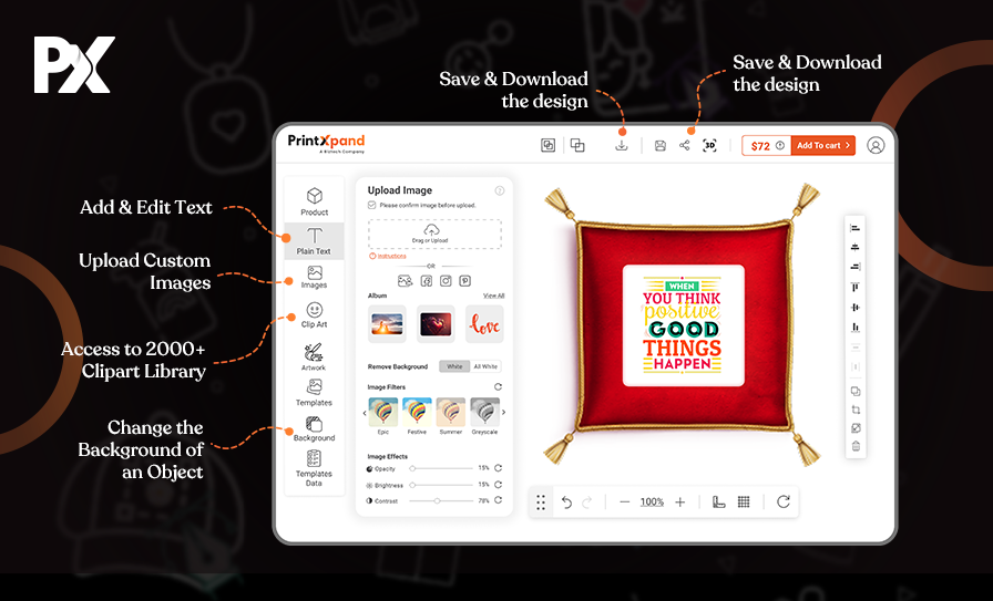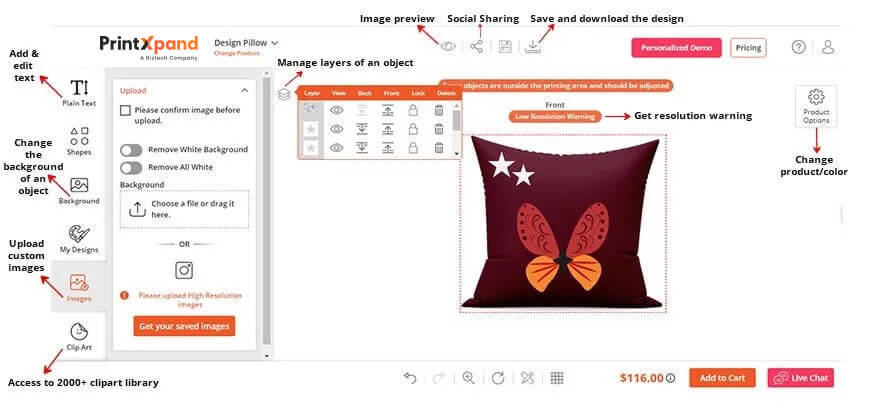 The best part of the tool is that it is entirely customizable. You can configure the tool’s UI to match your brand. As an admin, you get complete control over the tool’s backend, where you manage functionalities the way you want. For instance, you can adjust the design area, manage image effects and colors, control object editing, and more.