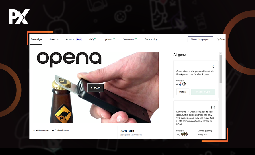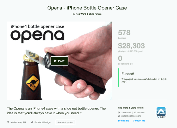 Opena is an iPhone case with a slide-out bottle opener. It was launched on the Kickstarter project in 2011. It successfully raised $28,303 (surpassing its initial $15,000 target.) People were willing to buy it when it was just a prototype.