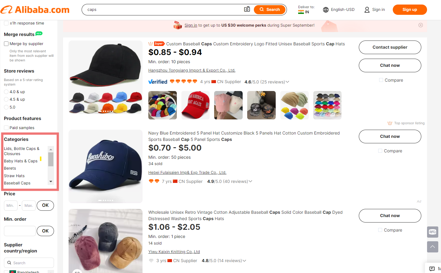 Alibaba is one of the biggest marketplaces that has a huge online wholesale and manufacturer database. You can search for items either based on suppliers or products. Type a keyword, and you will see a list of products. You can filter results by product sub-categories, price, supplier country/region, production certificate, etc.