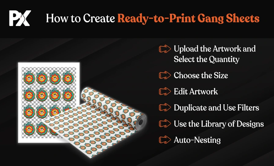 You can implement auto-nesting to efficiently create gang sheets by automatically arranging designs so they fit together as tightly as possible. Auto-nesting uses an intelligent algorithm to determine the most economical layout, reducing material waste and making your print job cost-effective.