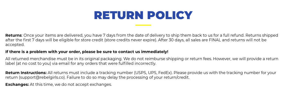 Below is the return policy by Rebel Girls. It clearly explains return requirements and shares contact information for further queries, and hence it works.