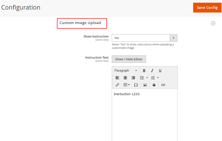 - Select “Yes” to show the instructions while uploading a customized image. Along with it, also enter the instructions that you want to display on the frontend.