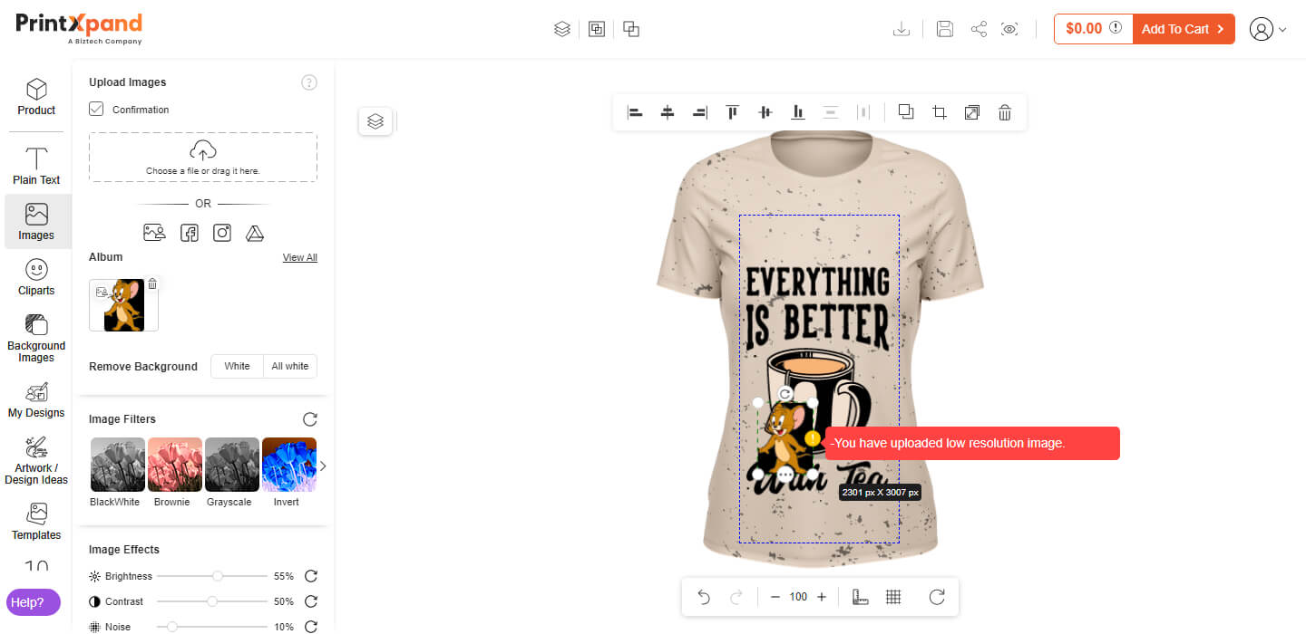 It works on an array of products that has a printable surface. So, whether you sell apparel or jewelry or cards, you can integrate any number of products, and varied kinds of products with the tool.