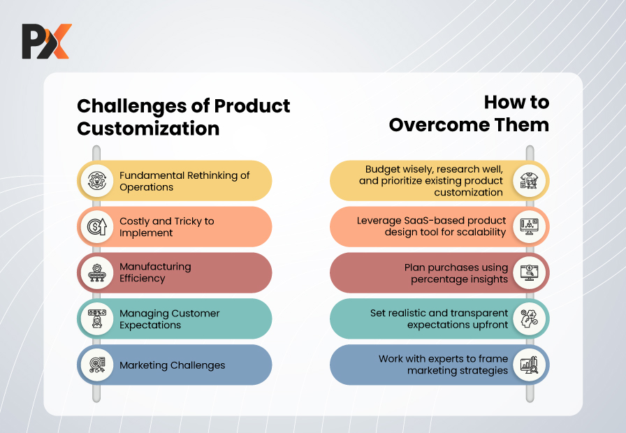 The first and most important challenge that product customization enforces is the fundamental rethinking of operations. Everything from web design to order management, shipping, the the way the operations run. Everything from web design to order management, shipping, manufacturing process, equipment, and so on needs replanning.
