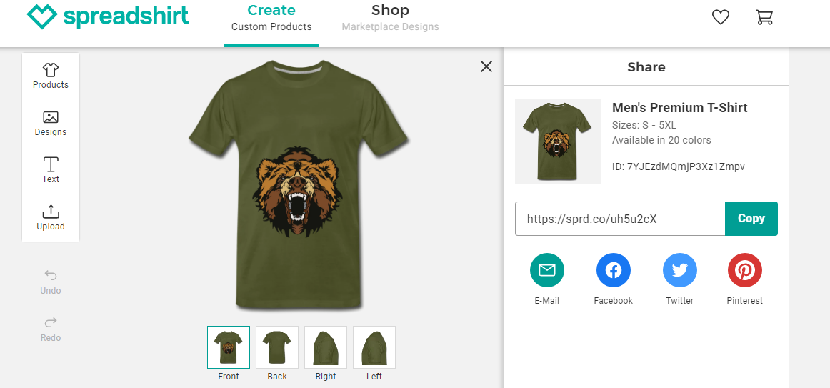 When it comes to custom shirts and t-shirts, Spreadshirt does a good job. The brand’s marketing strategy revolves around product customization. Their product customization software allows customers to express their style by making their t-shirts or other products. Their tool is user-friendly and practical, with helpful features. The t-shirt design tool also lets users add text, images, save the design, share, and more.