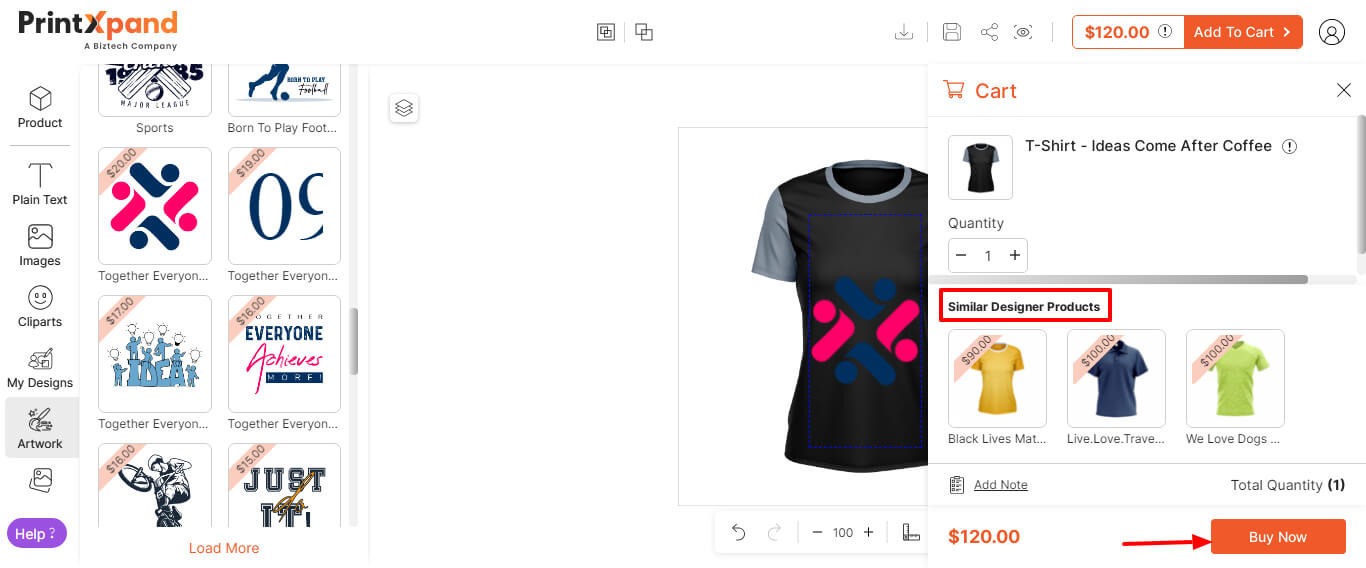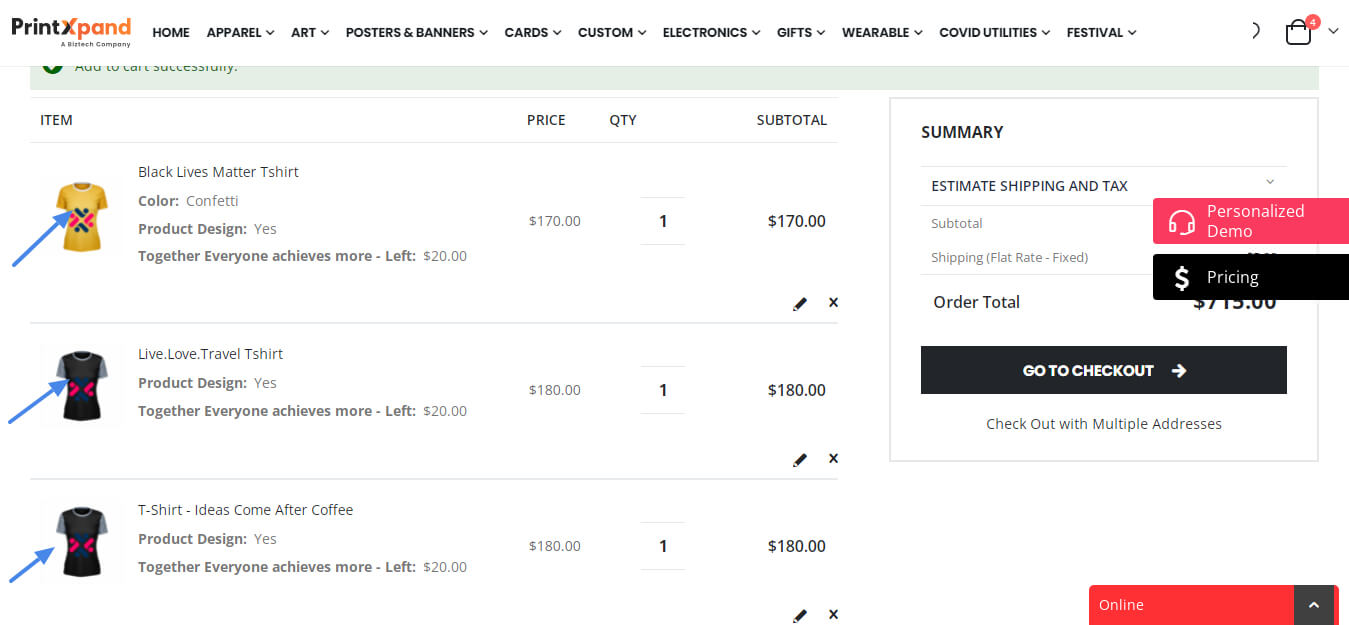 After adding to the cart, when they click on the buy now button, the design will automatically be added to the rest of the products. As shown in the image below, the design gets applied to other products. That way, they can quickly finish customizing and checkout.