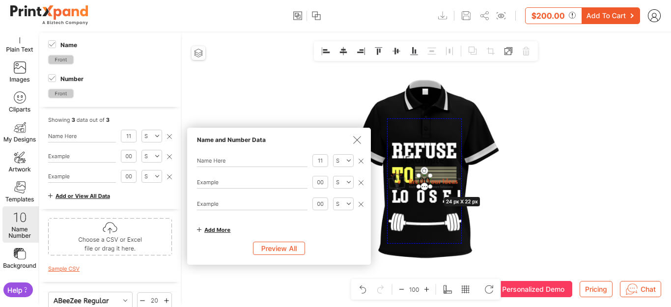 If you sell sports apparel, this is a must-have feature. The name and number import feature enable users to upload a bunch of names and numbers. Additionally, they can get a preview of all the products in one go using the preview feature.