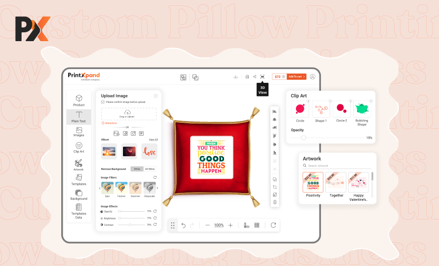 Our PrintXpand The Product Design Software or the online product design tool makes it possible for customers to put their pillow cover ideas on the canvas! Talking of text features, it offers font manager, quotes, custom text and messages. On the other hand, the image feature allows customers to apply effects, upload an image of their choice, use watermarking, and much more.