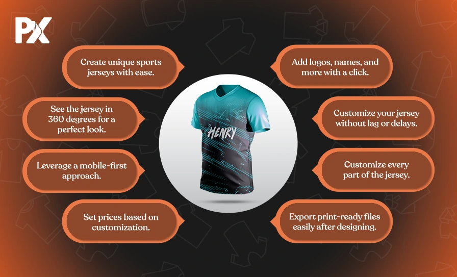 A product customizer tool allows buyers to personalize their sports jerseys with their own designs, text, and graphics.