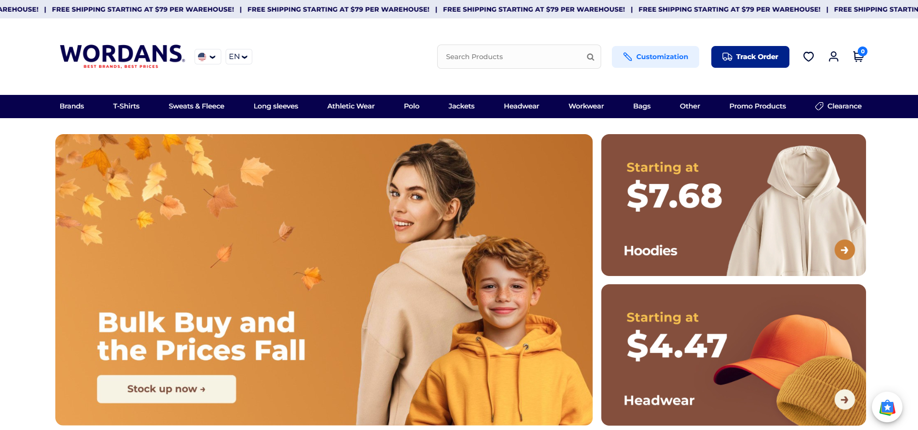 You get a wide range of categories like organic, tees, fleece, sweatshirts, bottoms, activewear, accessories, tearaway, and more to choose from. It offers both sustainable fabrics like organic, organic cotton, viscose bamboo, organic RPET, and essential fabrics like Tribeland, 50/50 Bland, Modal/Poly, Polyester, etc. And you can avail free shipping on all web orders exceeding $350.