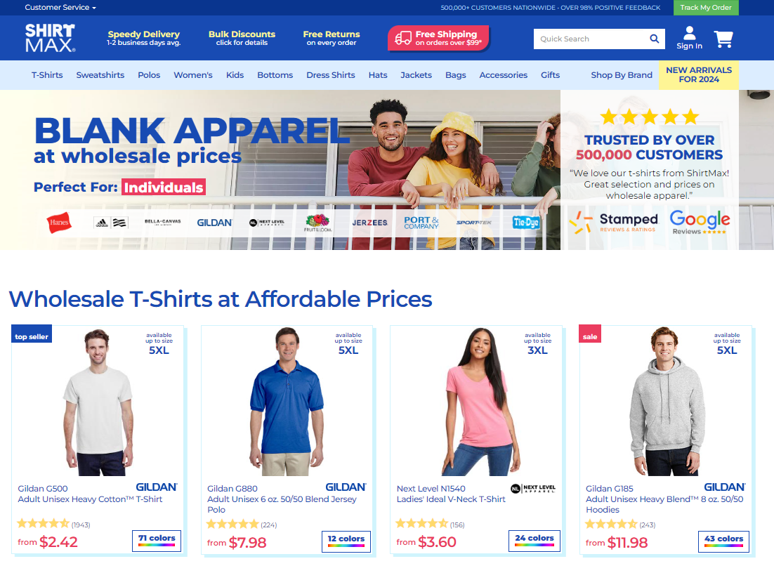 Offering delivery in 1-2 business days on average, free returns, and bulk discounts, Shirt Max is one of the premier places to source wholesale apparel.