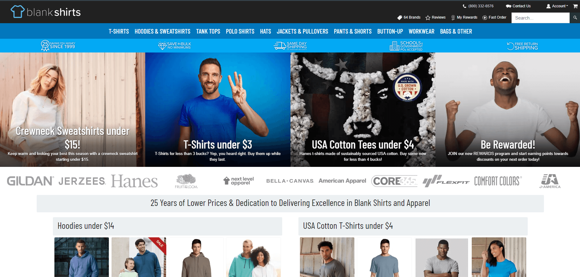 Beyond its reputation as a wholesale bulk t-shirts supplier, it also has to offer a variety in tank tops, polo shirts, blank hoodies, bags, hats, pullovers and what not. On top, same-day delivery is available for 99% of orders placed before 11 am on normal business days. It doesn’t have any minimum order requirement and offers easy returns within 30 days of receipt. With six warehouses located across the US in the states of Texas, New Jersey, Georgia, Illinois, Kansas, and Nevada, it ensures delivery of items is fast.