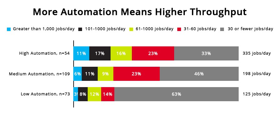 - Automation Leads to Profit – Participants in the survey with highly automated workflows report more jobs per day than respondents with less automation. High throughput links directly to profitability as it minimizes non-chargeable plant time. As shown in the below image, businesses with higher automation can produce 335 jobs per day, while businesses with lower automation can perform 125 jobs per day.
