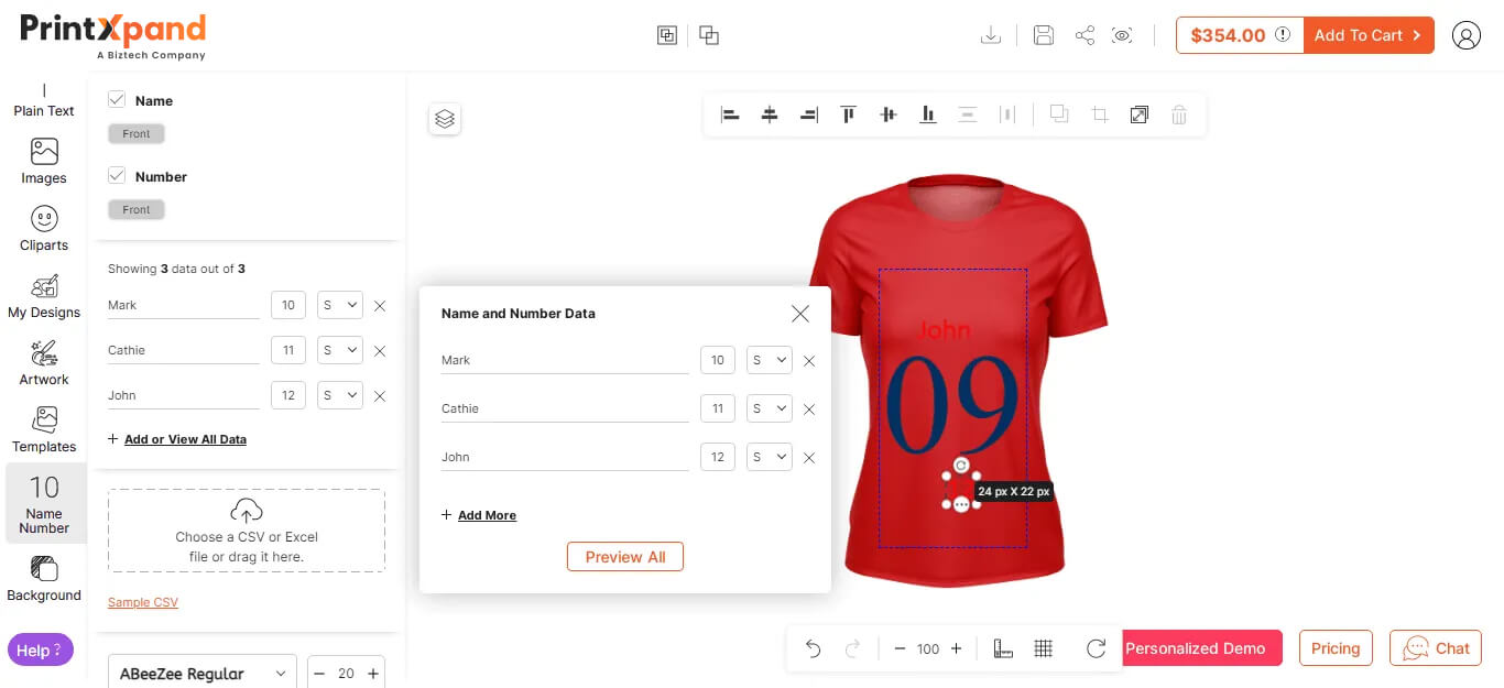 Secondly, the tool is a savior if you take bulk orders for custom sports t-shirts and other apparel. Using the name and number feature, your customers can directly upload a bunch of names and numbers on products.