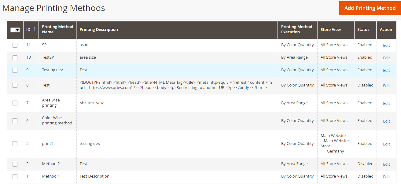 WooCommerce T-shirt designer lets you manage different printing methods and printing colors from the backend. Once you choose the option – manage printing method, you will get a list of printing methods with details like name, method type, printing description, etc.