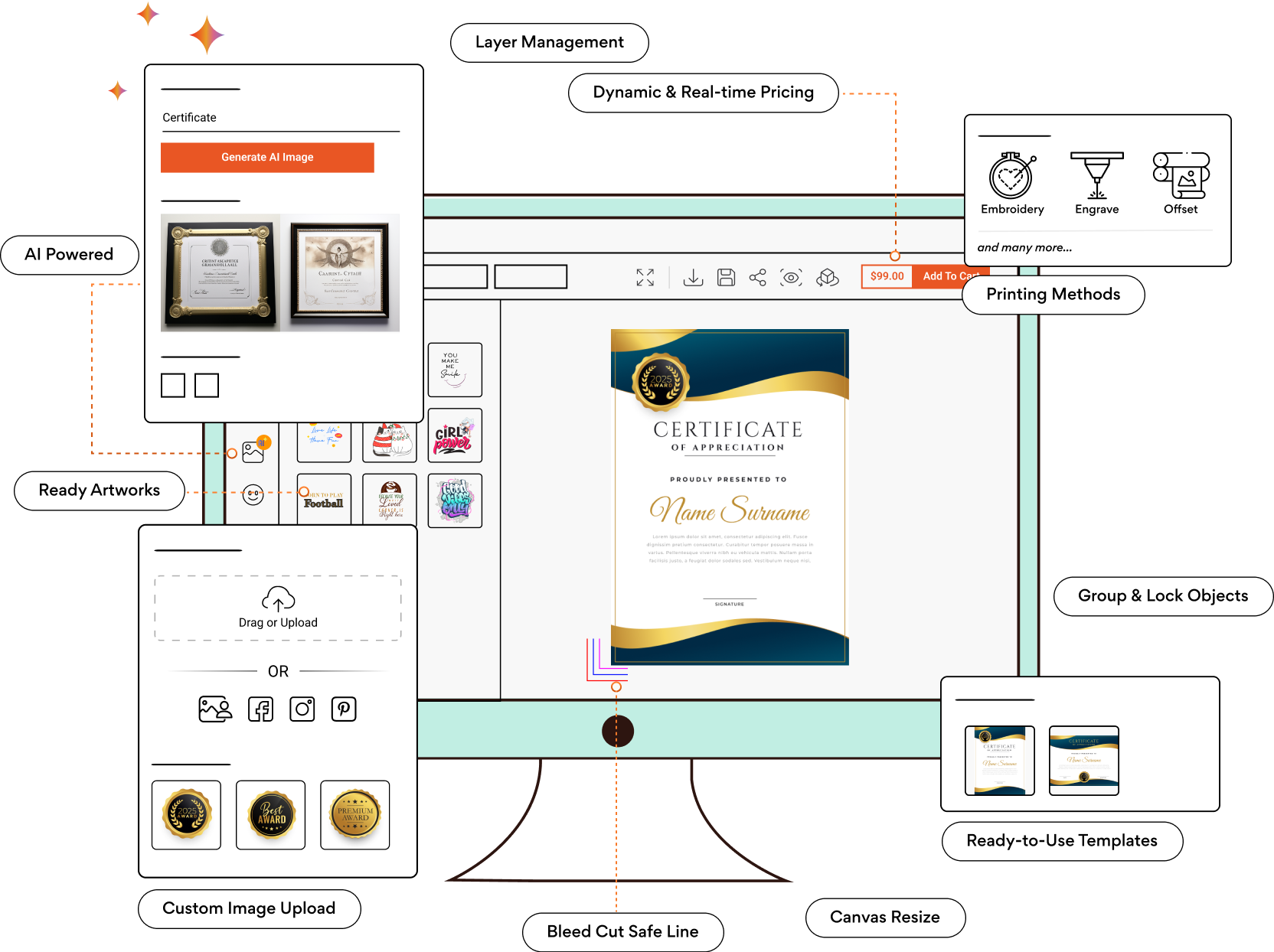 If you sell and print certificates online, our online certificate design software is the easiest way to enable customization on your website. Integrate the tool with the backend of your eCommerce admin panel and enable or disable features as needed.