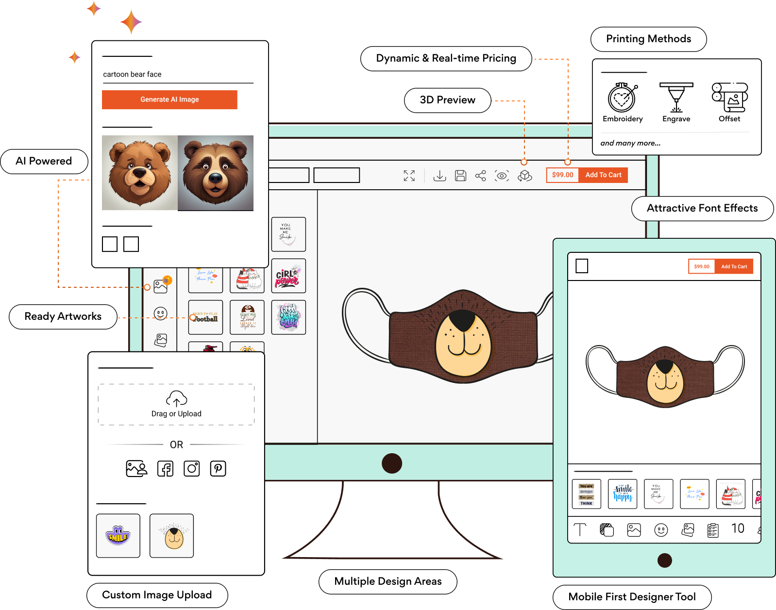 Our face mask design software is packed with advanced features like clipart, text, and ready-made templates that make your customer’s job swift.