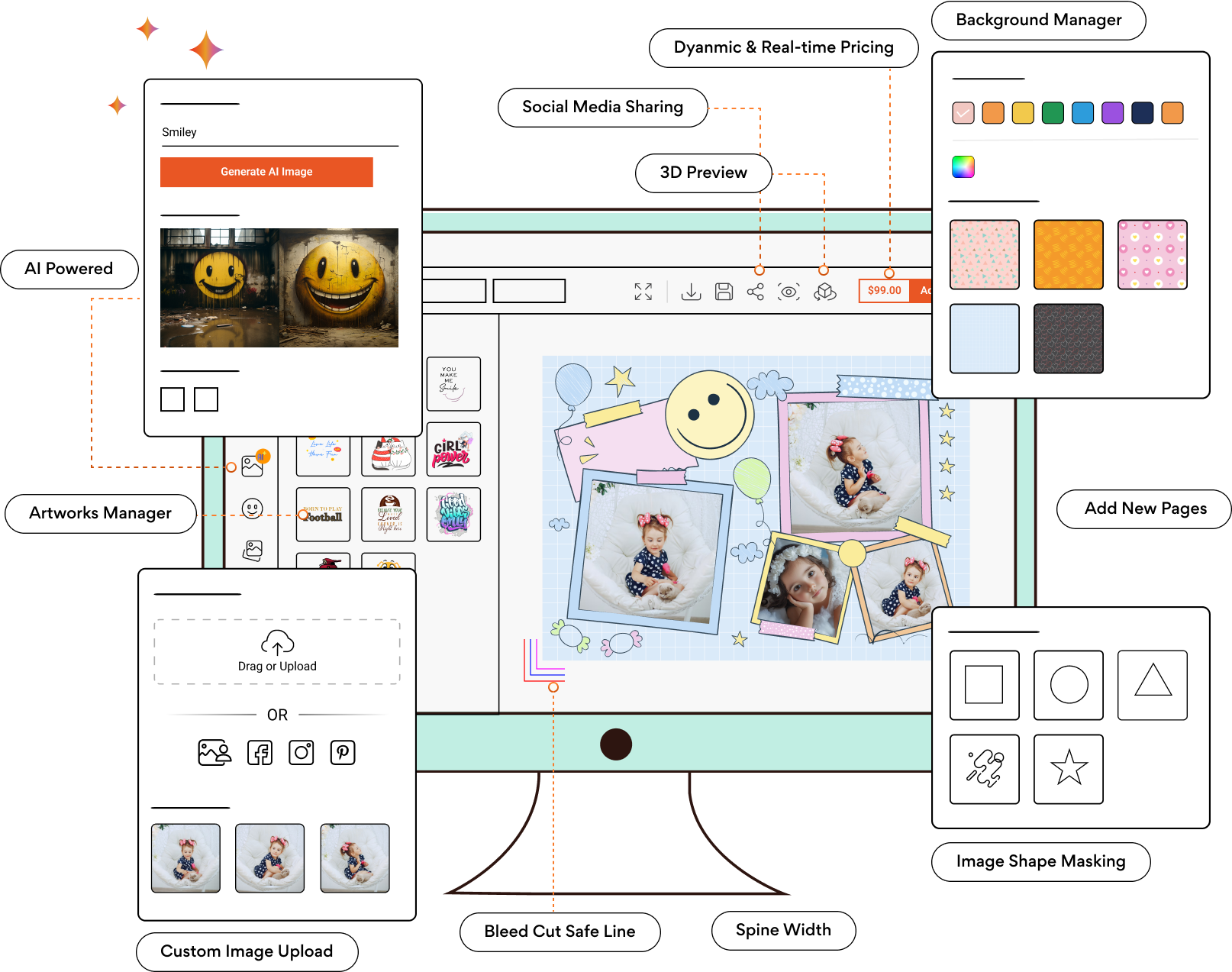 As far as your business logic is concerned, yes, the online photo album design software provides complete control over modification according to your unique brand identity. Additionally, you can enable or disable different features and integrate as many products as you want—the photo album design software can handle everything.