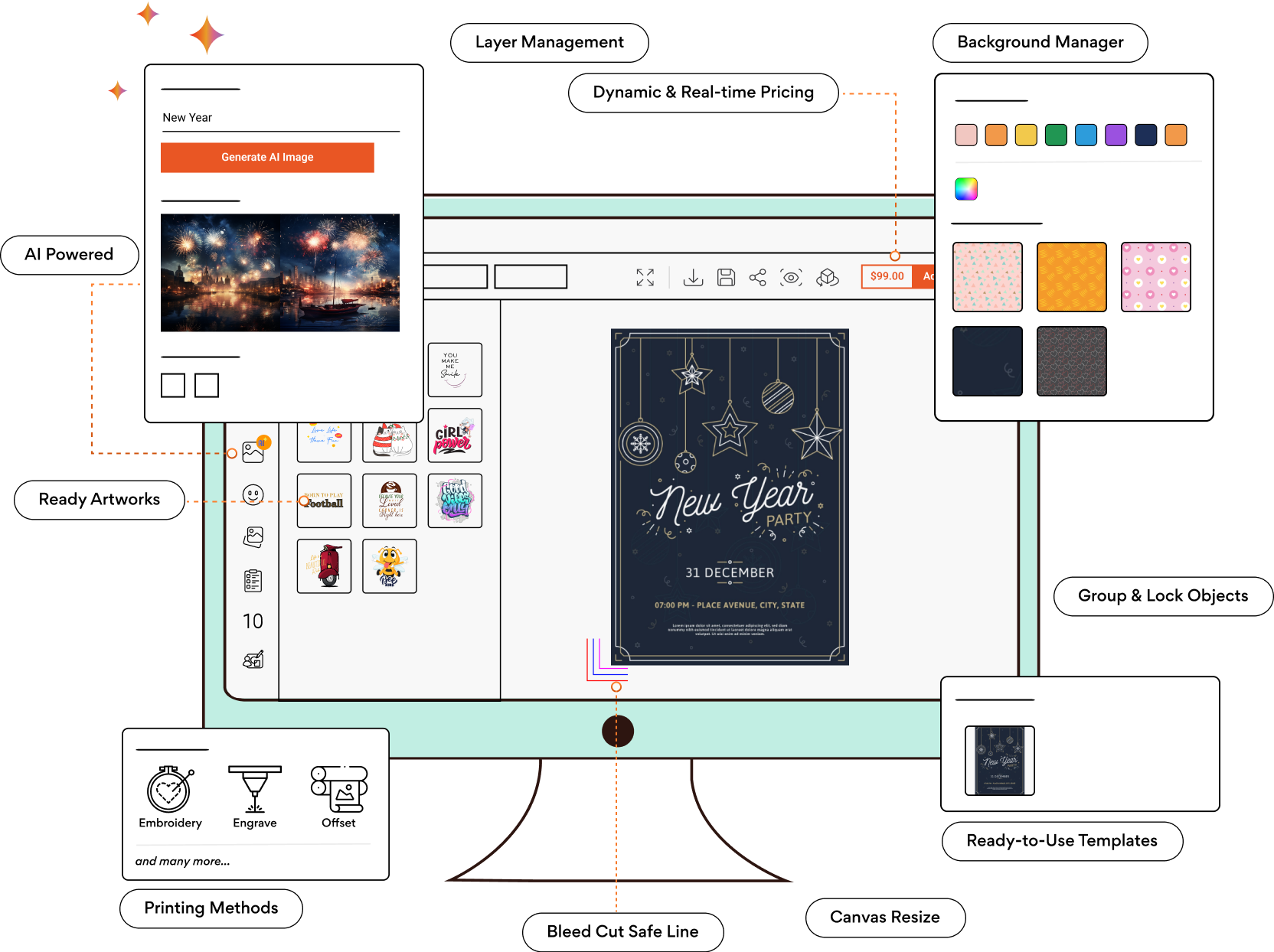 Our web-to-print solutions is designed to help you bring your business online even if you are just starting. It includes a designer tool, print MIS/ERP, and integrates smoothly with third-party tools.