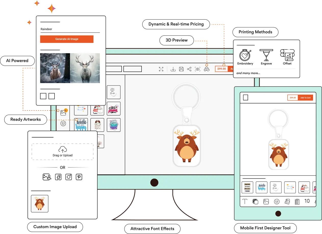 Elevate your promotional product personalization store with our customization tool. Seamlessly integrate it with your existing eCommerce platform and tailor it to match your branding needs.