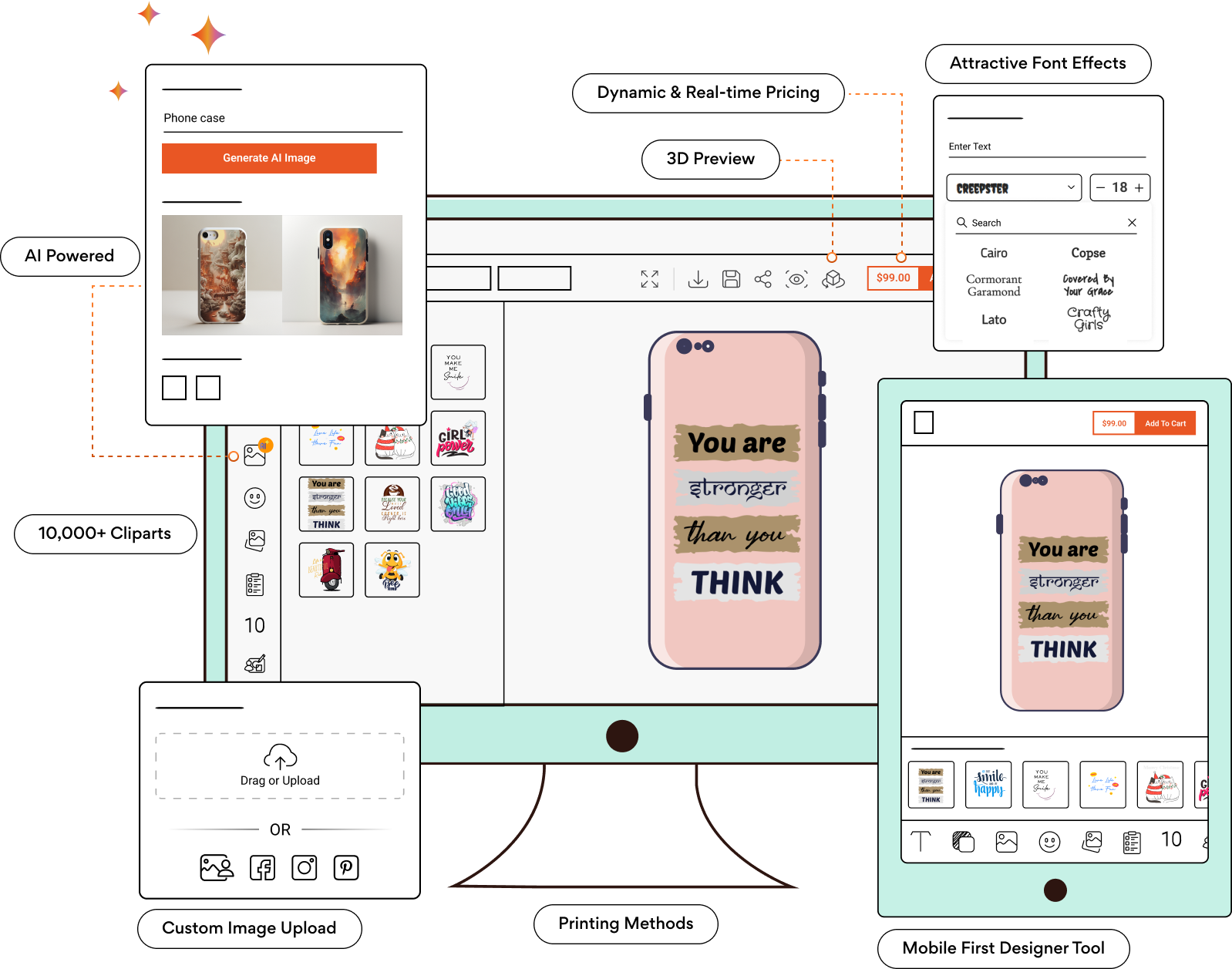 Apart from laptops and mobiles, your customers can also create designs on accessories like gaming consoles, helmets, surfboards, guitars, mp3 players and cameras. And you can also charge a premium price for the same! Additionally, our custom cover design tool can be integrated with every eCommerce platform.